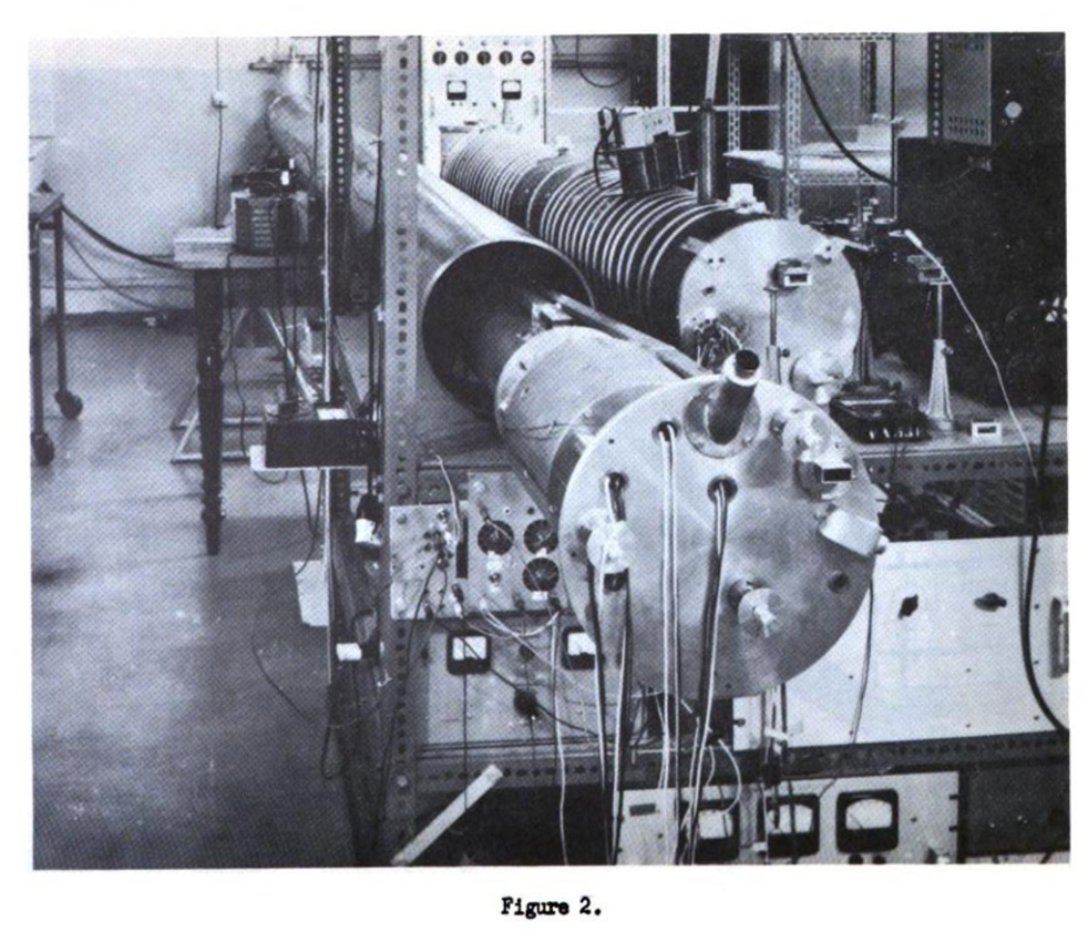 The figure “shows the beam tube almost within its vacuum tank. The pump is a 600 l/sec fractionating oil diffusion pump (Leybold type DO 501) baffled by a liquid nitrogen trap. It is mounted on the far end of the tank.”