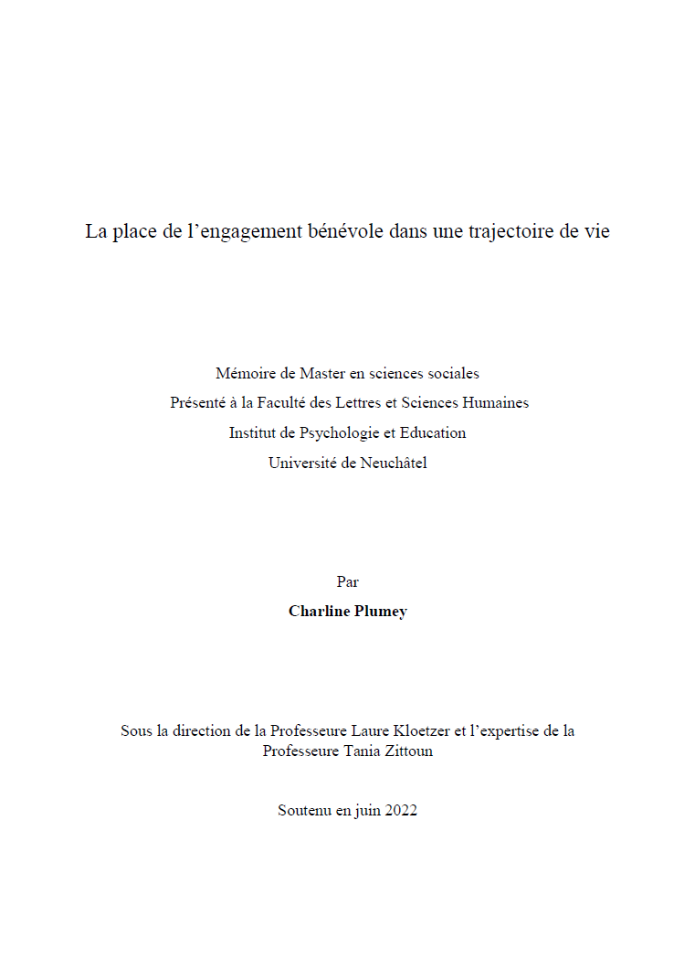 Plumey Charline - La place de l’engagement bénévole dans une trajectoire de vie UNINE MEMOIRE 2022.pdf