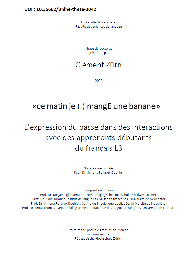 The thesis presents a qualitative analysis of the linguistical und interactive tools used by seven lower sec-ondary school students (10th degree HARMOS) when it comes to narrating what they have been doing in the past. The longitudinal study is based on a corpus of approximately seven hours of video recording, collected over one school year (2017-2018) in three secondary schools of Canton Zurich. The interactions took place outside the classroom, with the aim of creating a situation with some characteristics of an au-thentic conversation. The interpretation of the data was made according to the method of conversational analysis. It focuses on the use of past morphology and conversational strategies aimed at overcoming pro-duction or communication difficulties. The study has a dual objective: (i) analyse the ability to produce accounts of past events by elementary school learners, from a holistic perspective that considers both lin-guistic and interactive dimensions; (ii) identify the interactive verbal and mimogestural processes used by the L1 speaker to support the production of stories. With (i), the thesis contributes to a better knowledge of both the development of verbal morphology and the development of interactive competences of begin-ner learners in a school environment. With (ii) it broadens our knowledge of the complexity of supporting interactional processes and more generally of strategies aimed at overcoming communicative obstacles, by paying attention to the interface between the participants' verbal and mimogestural behaviour.