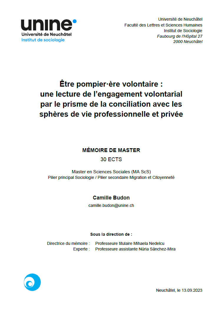 Ce travail de Master est une exploration dans le milieu des sapeur·se·s-pompier·ère·s volontaires et repose sur une enquête de terrain réalisée dans le canton de Neuchâtel au moyen d’une dizaine d’entretiens avec des engagé·e·s volontaires. Alors qu’elles et ils représentent en Suisse l’immense majorité des effectifs des casernes, le contexte d’exercice de ce type de volontariat demeure peu discuté en sciences sociales. Cet environnement est pourtant sujet à de nombreux défis (engagement et rétention des pompier·ère·s volontaires, disponibilité et flexibilité des effectifs, relations entre corps professionnels et volontaires, inclusion et féminisation des casernes, etc.) et à d’importantes transformations (diversification des interventions, élargissement des formations, professionnalisation du secteur, risques environnementaux, etc.). Dans ce contexte, je propose d’étudier comment certain·e·s volontaires poursuivent leur engagement en tant que pompier·ère·s et de quelle manière leur implication dans la « sphère volontariale » est rendue possible. Pour ce faire, je mobilise le prisme de la conciliation afin d’étudier l’engagement en tant que pompier·ère. Traditionnellement ancrée dans des représentations féminines, l’étude des enjeux de conciliation des pompier·ère·s volontaires constitue une porte d’entrée nouvelle pour aborder l’engagement dans un milieu à forte « hégémonie masculine » (Pfefferkorn, 2006). À travers cette problématique, je mets en évidence la manière dont les pompier·ère·s volontaires concilient leur activité parallèlement à leurs responsabilités et occupations dans les sphères de vie traditionnelles, que je définis comme la sphère de vie professionnelle et la sphère de vie privée. Cette étude permet également de circonscrire leur engagement et son ampleur, alors qu’il existe en Suisse différents types de casernes et de conditions d’exercice du volontariat (existence de piquet, responsabilités, grade, etc.). Cette recherche offre une lecture sociologique de l’engagement des pompier·ère·s volontaires ainsi qu’une meilleure compréhension des modalités de conciliation dans le milieu méconnu des casernes.